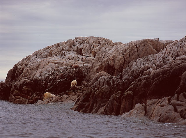 As we navigate up the lengthy Iqualuit Bay, we pass by Chase Island and its rugged, rocky shoreline. Near the far end of the island, we also come upon two polar bears munching on the remains of a seal. Because we are relatively close to the city of Iqualuit, and the villagers shoot bears that venture into town, unlike the other polar bears that we have seen on this trip that show no fear of our presence, these bears do not like our close pass, and so they clamber off into the rocks, and disappear from sight. I am sure once we are gone, they will return to the kill, because everybody knows there is nothing like a tasty seal for breakfast.