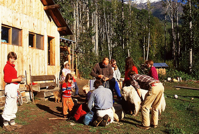After a huge dinner of venison stew, and a ton of fresh vegetables from their garden, everyone retired early because it was decided that the next day would be spent summiting the mountain behind their homestead. In the morning the skies were clear and the day was warming, so we began creating a lunch stash, and packing our daypacks. Of their several children, most were too young to make the all-day climb, but the oldest of them, Leaf (to the left), would join us. Neighbors came over to watch the other children while we were gone, and of course, everybody had a dog,..or two,..or three, so there was quite a posse in yard as we prepared to depart.