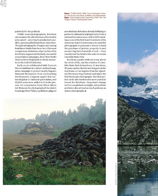 You probably know the photographers who blazed the trail for Ketchum’s unprecedented use of photography for environmental advocacy — William Henry Jackson, Ansel Adams and Eliot Porter. Just as Jackson’s 1871 photographs of Yellowstone were the argument that convinced legislators to preserve it as America’s first national park, Ketchum’s 1980s photographs of Alaska’s threatened Tongass rainforest were instrumental in leading Congress to set aside a million of its oldgrowth acres as America’s largest national forest — all off limits to logging.